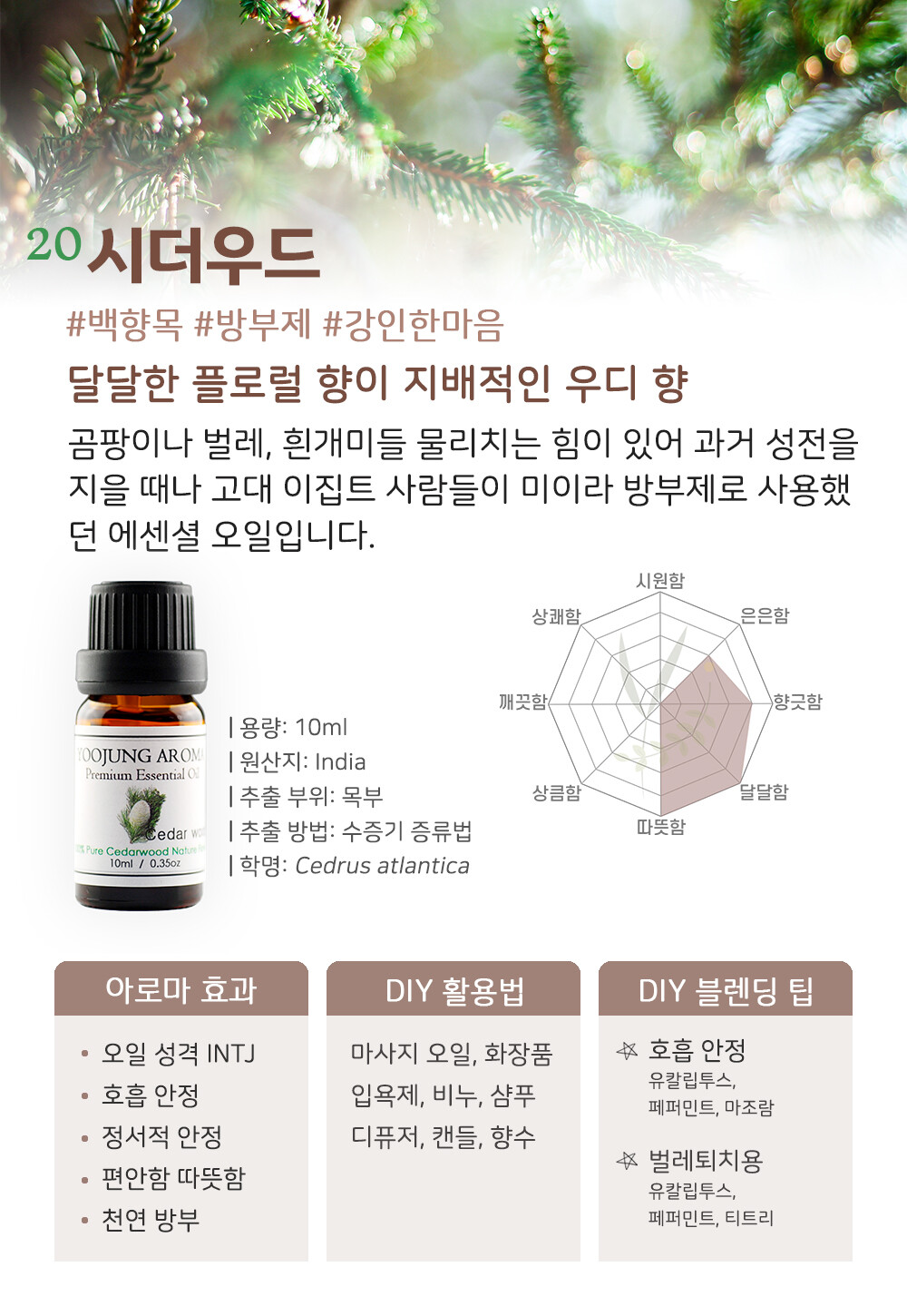 백향목으로 불리는 시더우드는 곰팡이나 벌레, 흰개미들 물리치는 힘이 있어 과거 성전을 지을 때 많이 사용했습니다. 고대 이집트 사람들이 시신(미이라) 처리 방부제로도 사용했고 관을 만드는 데에도 사용한 나무입니다. ‘cedar’는 영적인 능력을 의미하기도 하고 굳은 신앙심을 나타내기도 합니다. 그래서 아무리 힘든 일이 닥쳐도 끝까지 밀고 나갈 수 있는 강한 마음을 가질 수 있도록 도와주는 힘이 강한 성질의 에센셜 오일입니다.