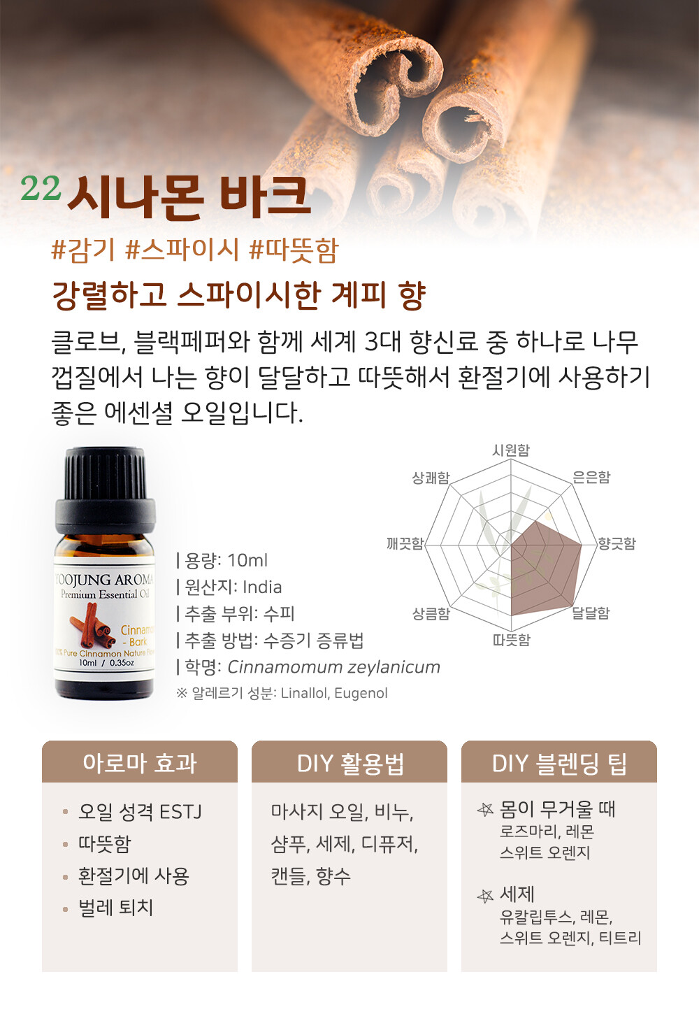 강렬하고 스파이시한 계피향이에요. 달콤한 계피 차를 마시는 기분이 들 거예요.
