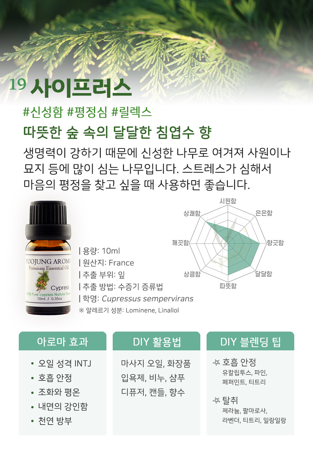 ‘semper(언제나)’ ‘virens(푸른)’ 혹은 ‘sempervirens(영원히 산다)’라는 뜻을 가진 사이프러스는 죽음에 대한 슬픔과 두려움을 뛰어넘는 생명력이 강한 신성한 나무로 여겨져 사원이나 묘지 등에 많이 심는 나무입니다. 감정 기복이 심할 때, 마음의 평정을 찾고 싶을 때 사용하면 좋습니다. 유칼립투스나 티트리 등과 같이 상쾌한 허브향이 나고 실내 공기 정화에 좋은 에센셜 오일입니다. 땀이 많이 날 때 피부를 수축해 발한을 억제하기 때문에 몸에 나는 냄새를 없앨 때 도움이 됩니다.