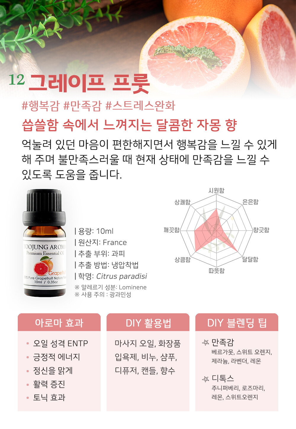 자몽 과실 그대로의 상쾌함과 신선함을 느낄 수 있는 에센셜 오일입니다. 중추 신경계의 균형을 유지시켜 걱정거리와 긴장으로 억눌려 있던 마음이 편한해지면서 행복감을 느낄 수 있게 해 줍니다. 스트레스를 받으면 단 과자나 음식을 찾게 되는 사람에게 현재 상태에 만족감을 느낄 수 있도록 도움을 줍니다.