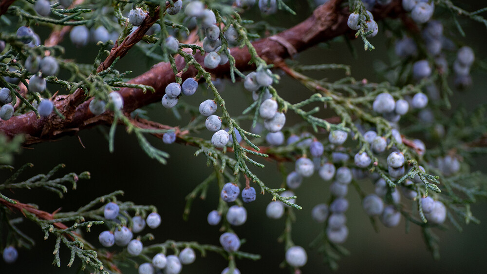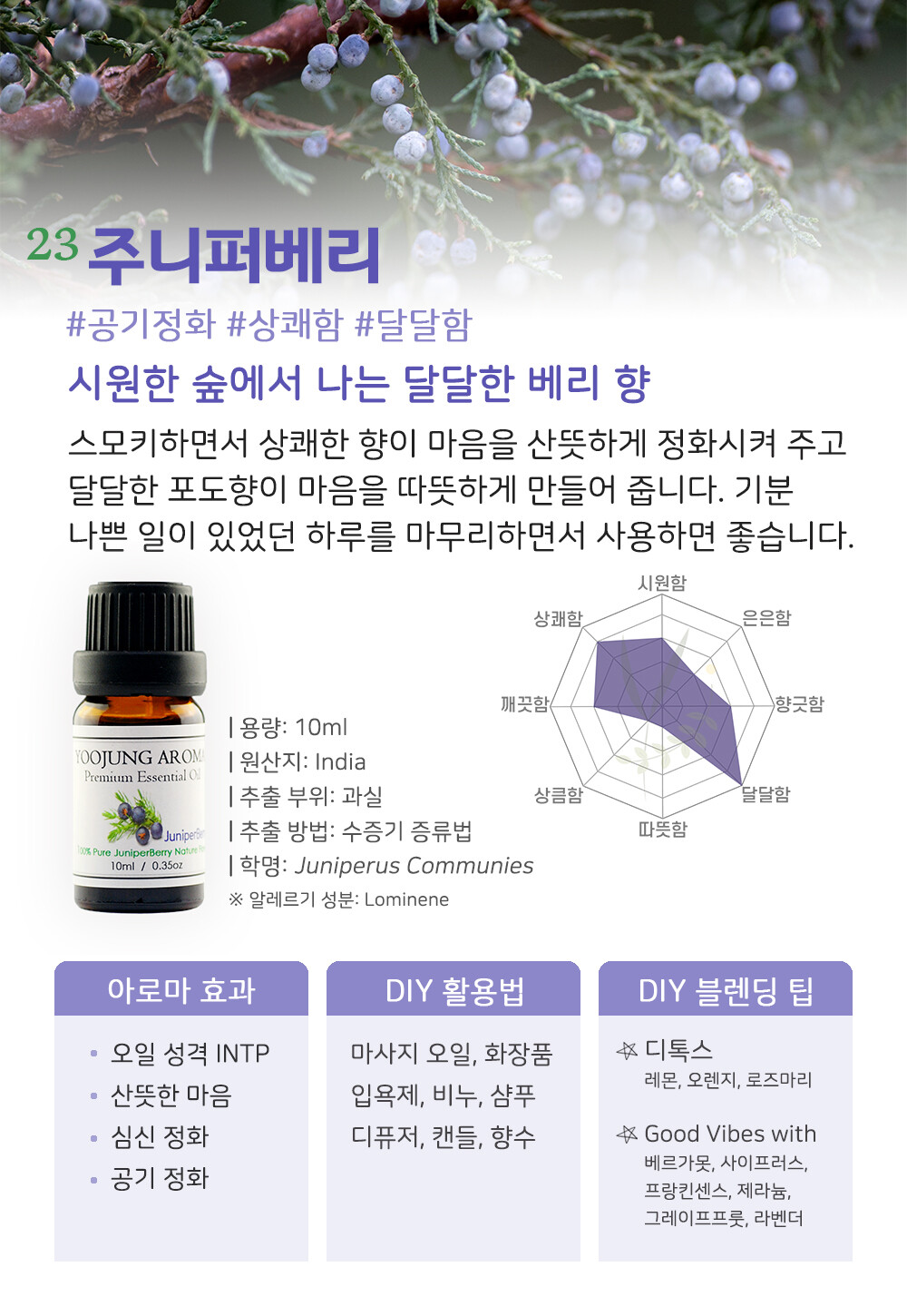 북반구에서 자생하는 침엽 상록수인 주니퍼의 열매에서 추출한 오일입니다. 초록색 열매는 2~3년이 지나야 흑청색을 띄게 되고 그 보라빛 열매를 수확해 추출합니다. 중세 유럽에서는 흑사병에 효과가 있다고 믿어서 주니퍼의 가지를 태워 공기를 정화하기도 했습니다.