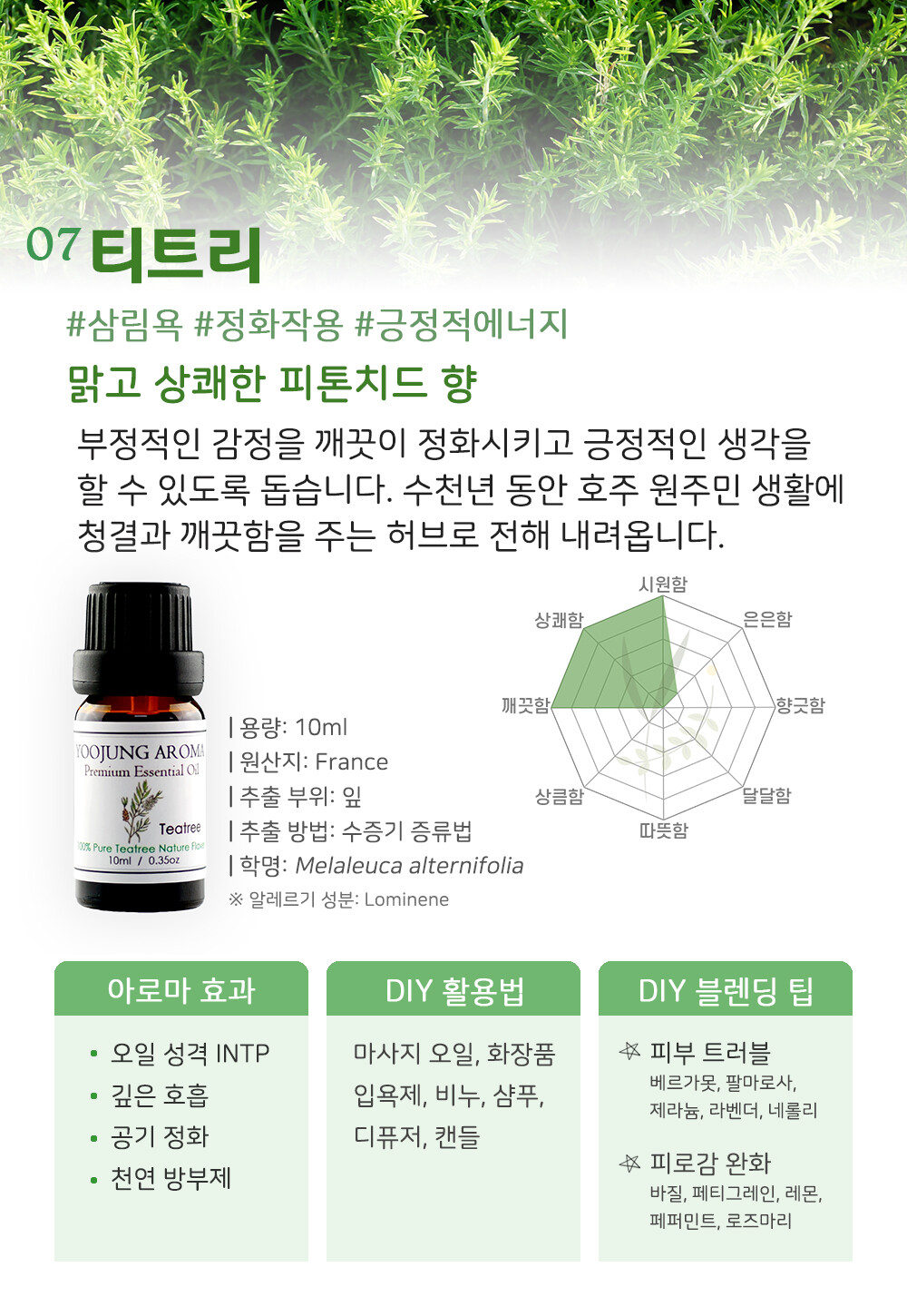 오래 묵은 스트레스나 부정적인 감정들을 깨끗이 정화시켜 긍정적이게 만들어주는 에센셜오일입니다. 호주 원주민들은 감기, 해열, 두통 등의 치료를 위해 잎을 차로 우려 마셨고, 제2차 세계대전 당시 호주 군인들의 상처와 피부질환 항염제로도 사용되었습니다. 또한 프랑스에서 의사들이 에이즈 환자의 면역 기능을 강화할 때 사용할 만큼 면역 기능 강화에 도움을 주는 에센셜 오일입니다. 강력한 방부효과 및 박테리아, 바이러스, 곰팡이를 박멸하기도 하며 피부관리에 있어서도 피부 정화작용을 하기 때문에 다양한 트러블을 개선시키는 역할을 합니다. 자고 일어나도 피로가 잘 풀리지 않을 때 레몬이나 로즈마리를 블렌딩해서 사용하면 활력을 되찾을 수 있습니다.