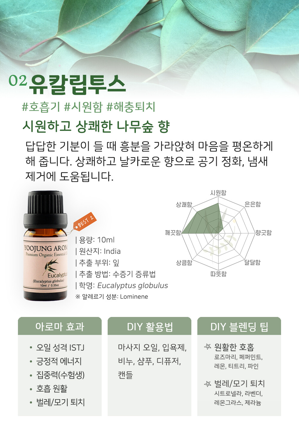 유칼립투스는 세계에서 가장 키가 큰 나무 중 하나입니다. 감염증이 발생하기 쉬운 다습한 지역의 공기를 건조하게 정화하는 힘이 있습니다. 심리적으로 숨이 턱 막히는 기분이 들 때 상쾌한 향이 몸과 마음 구석구석 스며들어 해방감을 느끼게 해 주면서 흥분을 가라앉혀 마음을 평온하게 해 줍니다. 강렬하게 톡 쏘는 향이 공부할 때나 일할 때 집중력 향상에도 도움을 줍니다. 레몬과 블렌딩하여 사용하면 공기를 살균 소독 정화하는 것에도 효과적이기 때문에 바이러스의 활동을 억제하는 역할도 합니다. 밤에 사용할 때는 라벤더와 블렌딩하면 덜 자극적이며 은은하게 사용할 수 있습니다.