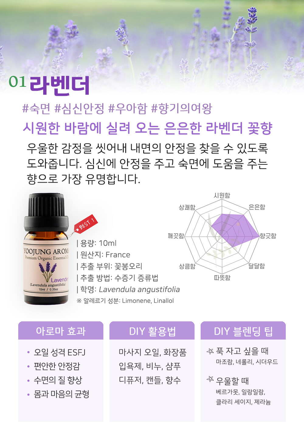 라틴어 ‘Lavare(씻는다)’에서 유래된 라벤더는 이름에 걸맞게 아픔이나 우울한 감정을 씻어내 내면의 안정을 찾고 자신의 원래 모습을 되찾을 수 있도록 도와줍니다. 피부가 민감한 사람, 남녀노소 안심하고 사용할 수 있고 효능이 다양하고 쓰임새가 많아 만능 에센셜 오일로 불리기도 합니다. 진정과 이완 효과가 뛰어나 심신에 안정을 주고 숙면에 도움을 주는 향으로 가장 유명합니다.